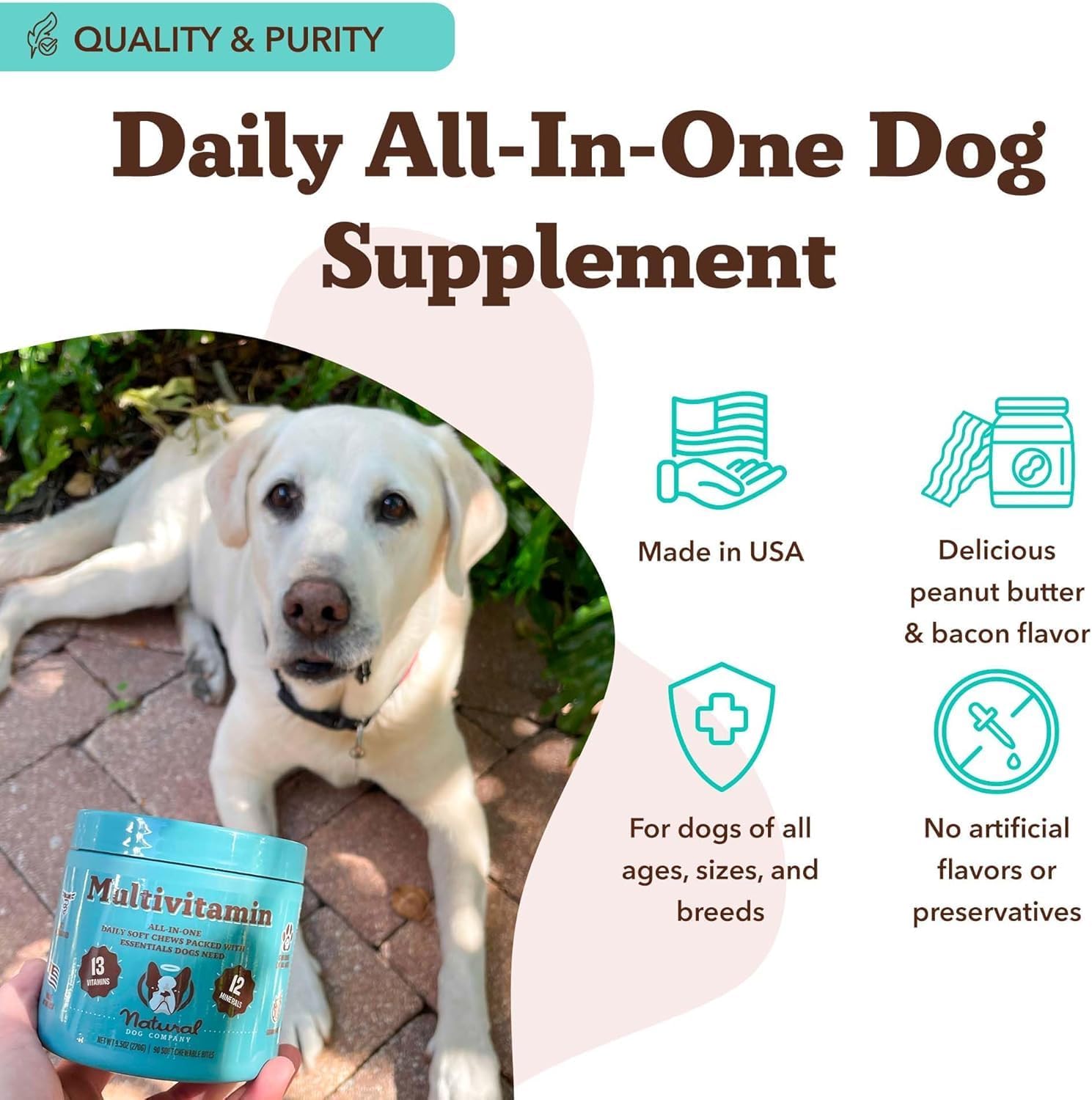 Natural Dog Company 25 in 1 Multivitamin for Dogs – Daily Soft Chews with Vitamins, Minerals & Antioxidants, Immune & Joint Support, for All Ages, Sizes & Breeds, Bacon & Peanut Butter – 90 Count