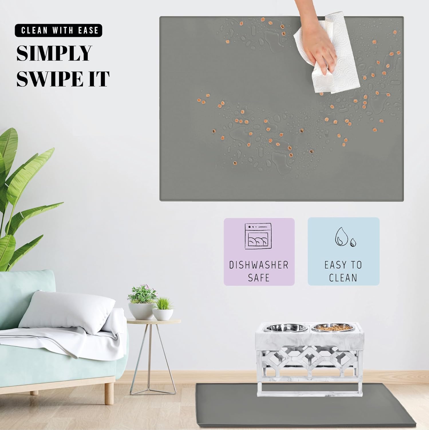 - Floor Protection: Protect your wood floor with our waterproof dog feeding mat. Thick and durable, this mat shields against spills and stains from dog or cat food and water bowls. Say goodbye to mildew worries. Ideal for pet owners who value clean and pristine floors