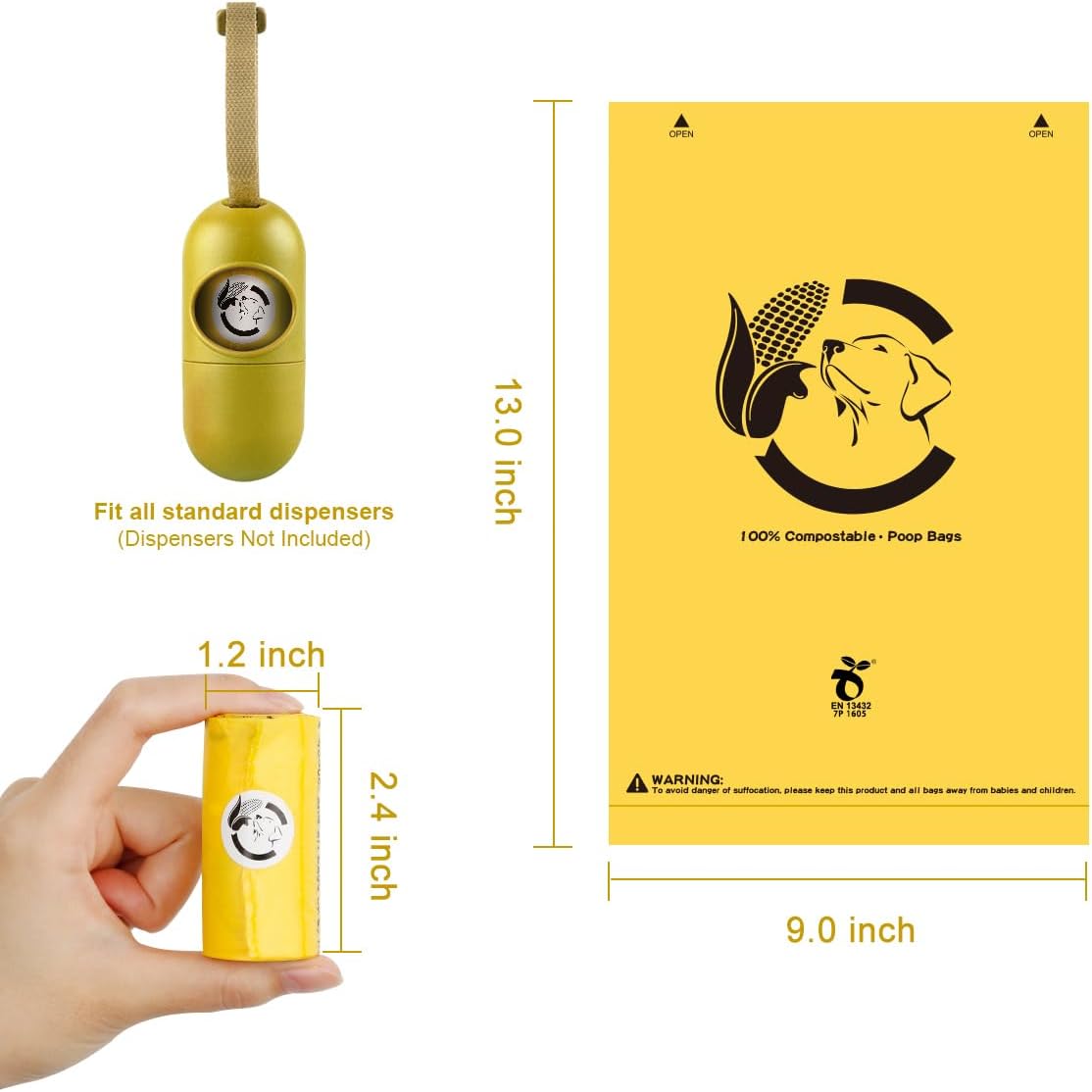 - What You Get: Receive 270 compostable poop bags in one purchase, packaged in 18 rolls with 15 bags per roll. Each bag measures 9 x 13 inches and fits perfectly in standard poop bag dispensers, providing ample space for large dogs and small dogs alike.