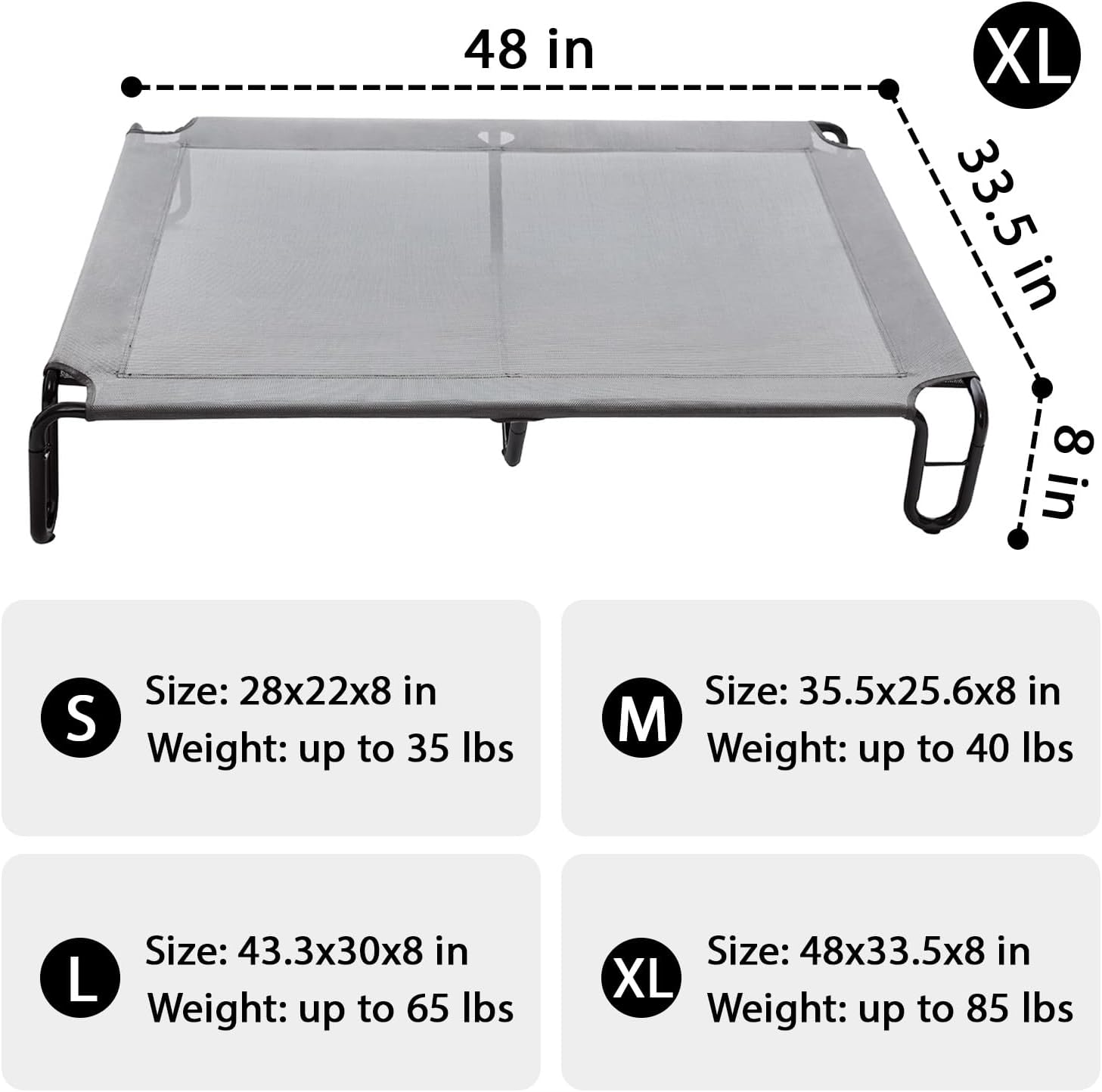 - Extra Large Dog Bed Dimensions: Pettycare Elevated Dog Cot Bed measures 48x33.5x8 inches. Fits up to 85 lbs. The 8" off-the-ground design promotes increased airflow on all sides of the raised dog bed, which helps keep your pet cool and creates low-impact areas to pressure points and joints, especially on rainy or hot days.
