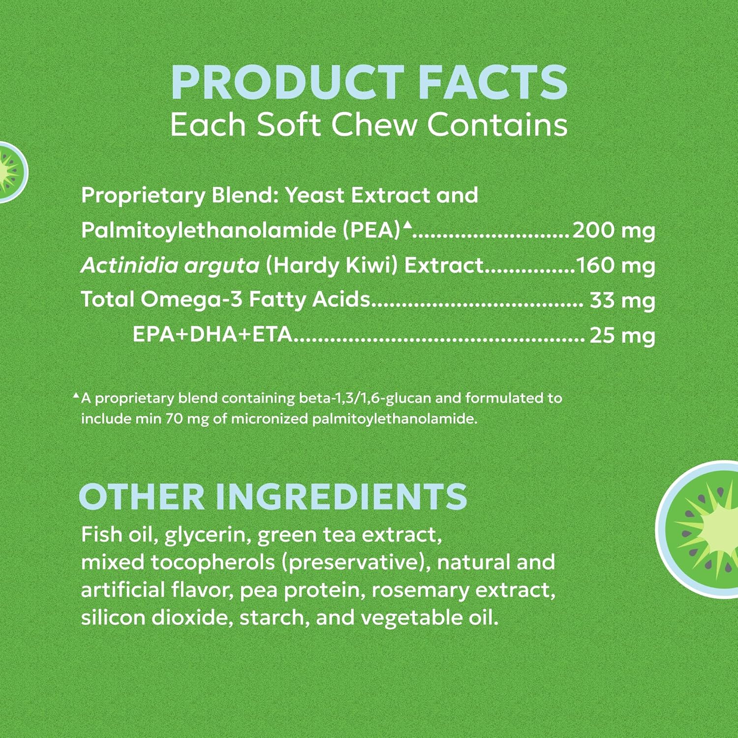 - Active Ingredients : Actinidia arguta (Hardy Kiwi) Extract 565 mg, Proprietary Blend: Yeast and Wheat Extracts* 455 mg, Total Omega-3 Fatty Acids 60 mg, Eicosapentaenoic Acid (EPA) 25 mg, Docosahexaenoic Acid (DHA) 15 mg, Eicosatetraenoic Acid (ETA) 1,000 mcg, Gamma-linolenic Acid (GLA) 60 mg. *A proprietary blend containing phytoceramides and beta (1,3)/(1,6) glucan MacroGard® Actinidia arguta (Hardy Kiwi) Extract 565 mg… See more