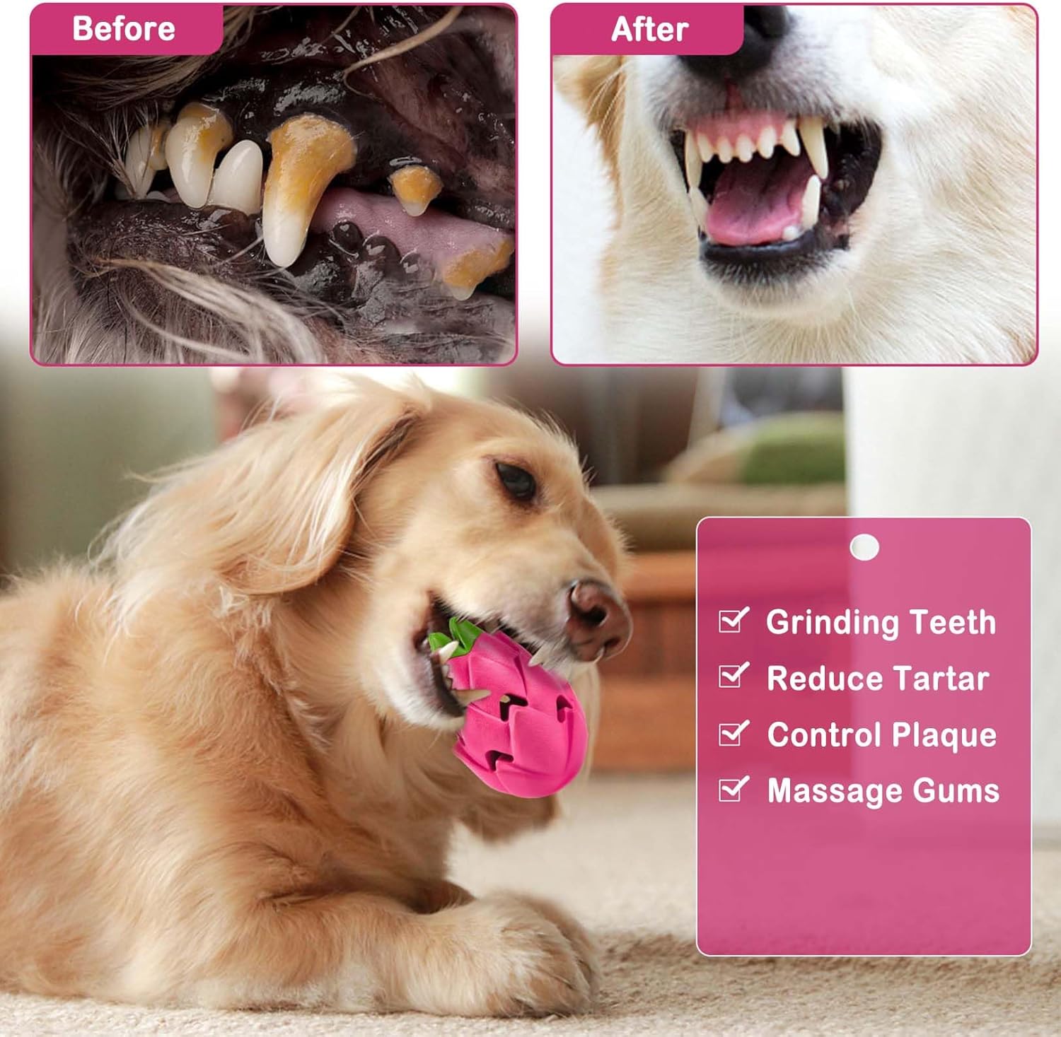 - π Promotes Dental Health: Our hollow pitaya design with its uneven surface and side holes, can apply dog toothpaste or peanut butter on it, attracting your dog's interest and helping them clean teeth while chewing. Promote better dental hygiene.