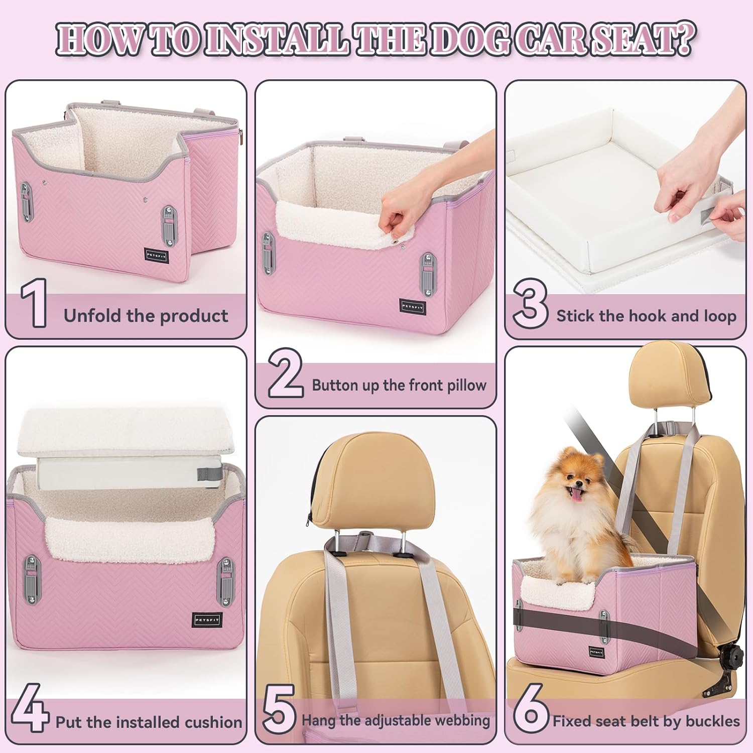 PETSFIT Dog Car Seats for Small Dogs, Portable Puppy Car Saet for Car with Clip-On Leash, Adjustable Straps Suitable for Small Pets Up to 25lbs (Light Pink)