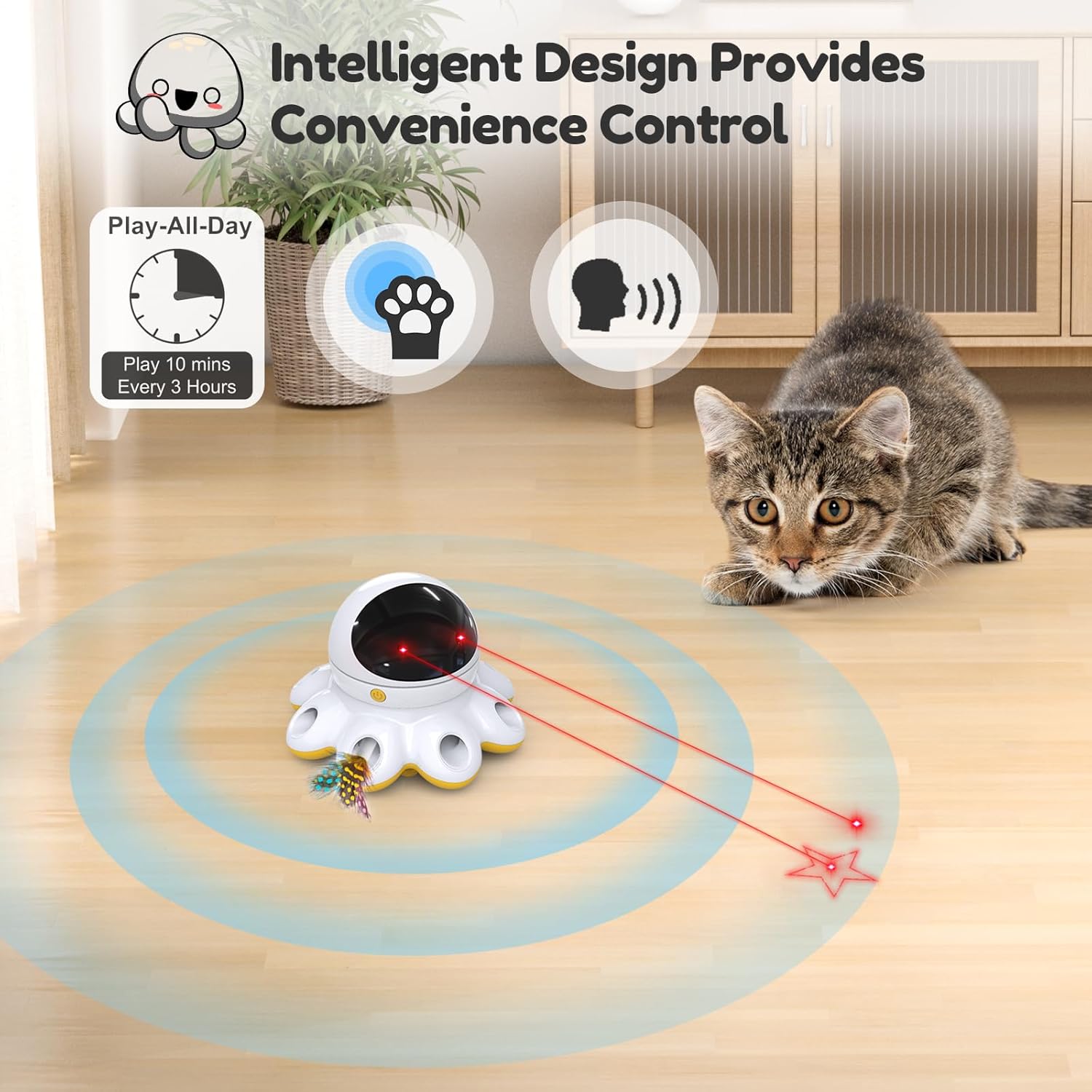 - 【Smart Indoor Cat Toy】 ORSDA intelligent Interactive kitten toy features voice and touch control which can automatically run for 10 minutes every 3 hours, during which time the cat laser toy will also automatically activate when the toy detects your kitten or pet's touch or voice, allowing indoor cat to play alone. Not only that, the whack a mole cat toy also has a night mode, the toy will automatically turn off at night to make sure you families have a good sleeping.