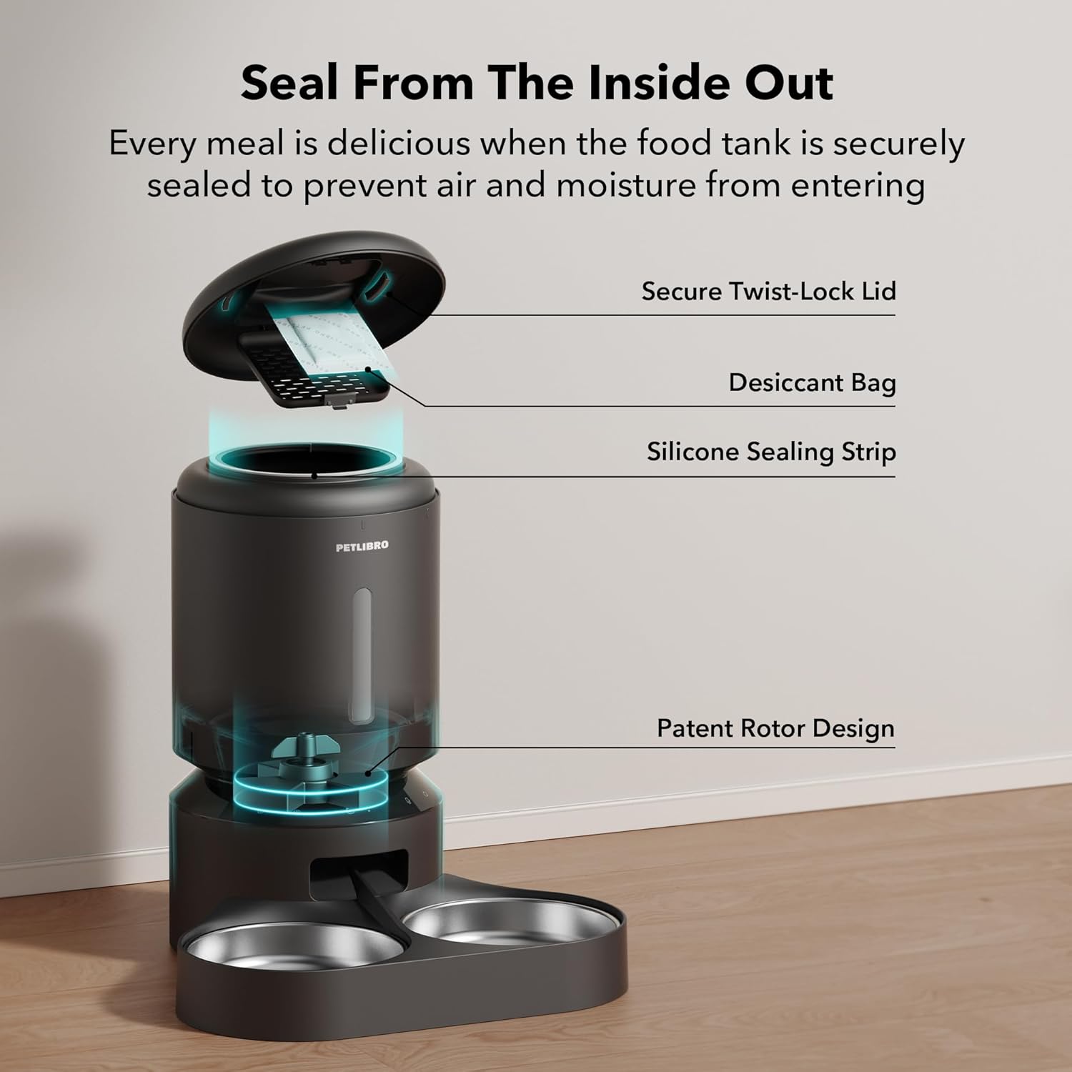 - MULTIPLE FRESHNESS PRESERVATION: the PETLIBRO automatic pet feeder has a built-in desiccanat and sealing strip to keep food fresh. Food grade stainless steel bowl, healthy and hygienic, easy to clean. Patented rotor and twist-lock lid design effectively prevents pets from stealing food.