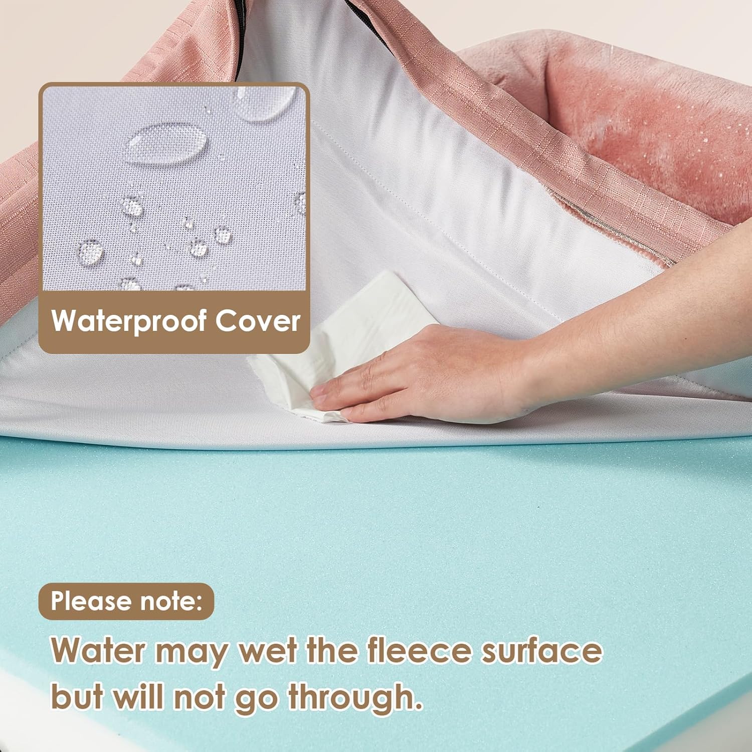 - WATERPROOF FILM and NON-SLIP BOTTOM: There is a waterproof film between the fleece surface and the bottom fabric that makes the dog bed waterproof. However, the faux linen on the side is not waterproof. A non-slip point on the bottom is not easy to slide, and keeps your dog bed steady.