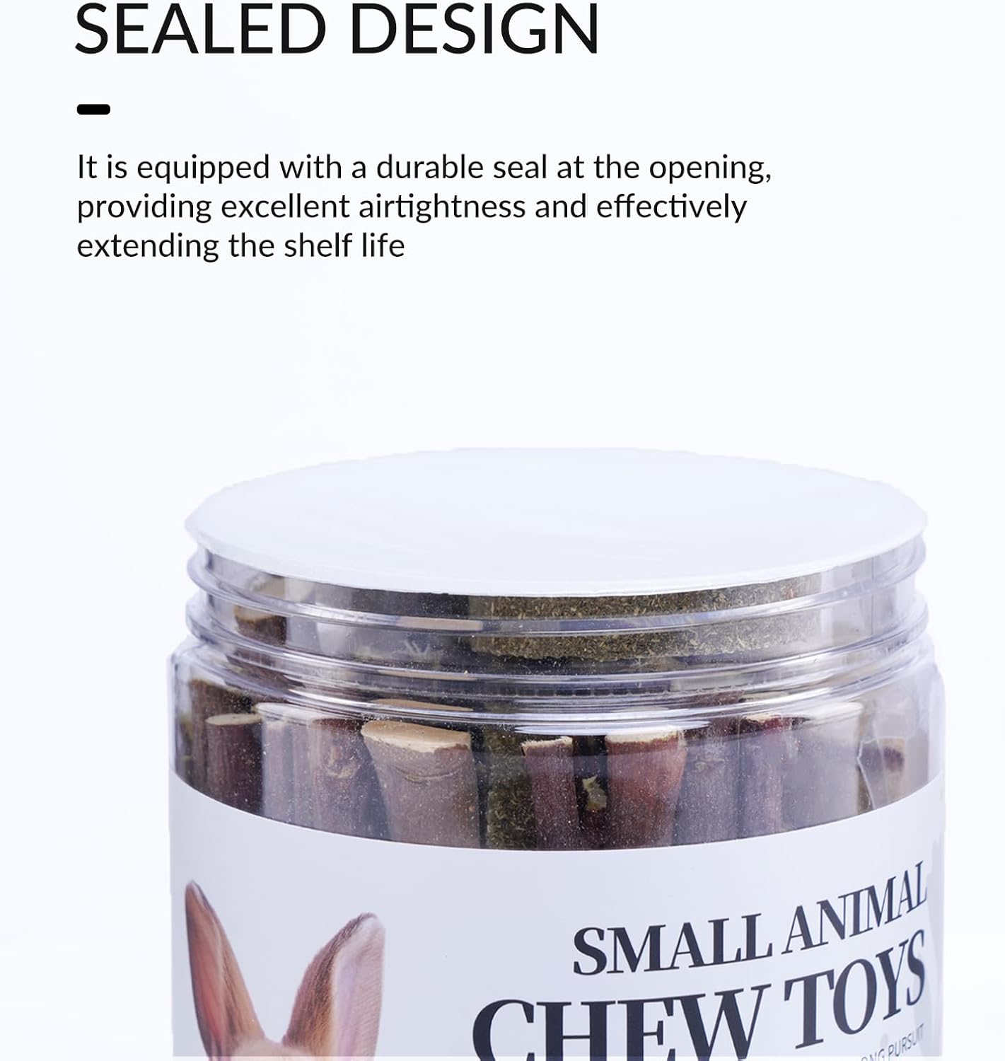 - 【Sealed Design for Rabbit Chew Toys for Teeth】The jar containing this rabbit chew toys is equipped with a durable seal at the opening, providing excellent airtightness and effectively extending the shelf life of the toys. The jar and lid are precisely threaded to ensure a tight seal when the lid is screwed on, preventing air and moisture from entering even when the toys are not in use. This also helps to extend the shelf life of the guinea pig chew toys for teeth.