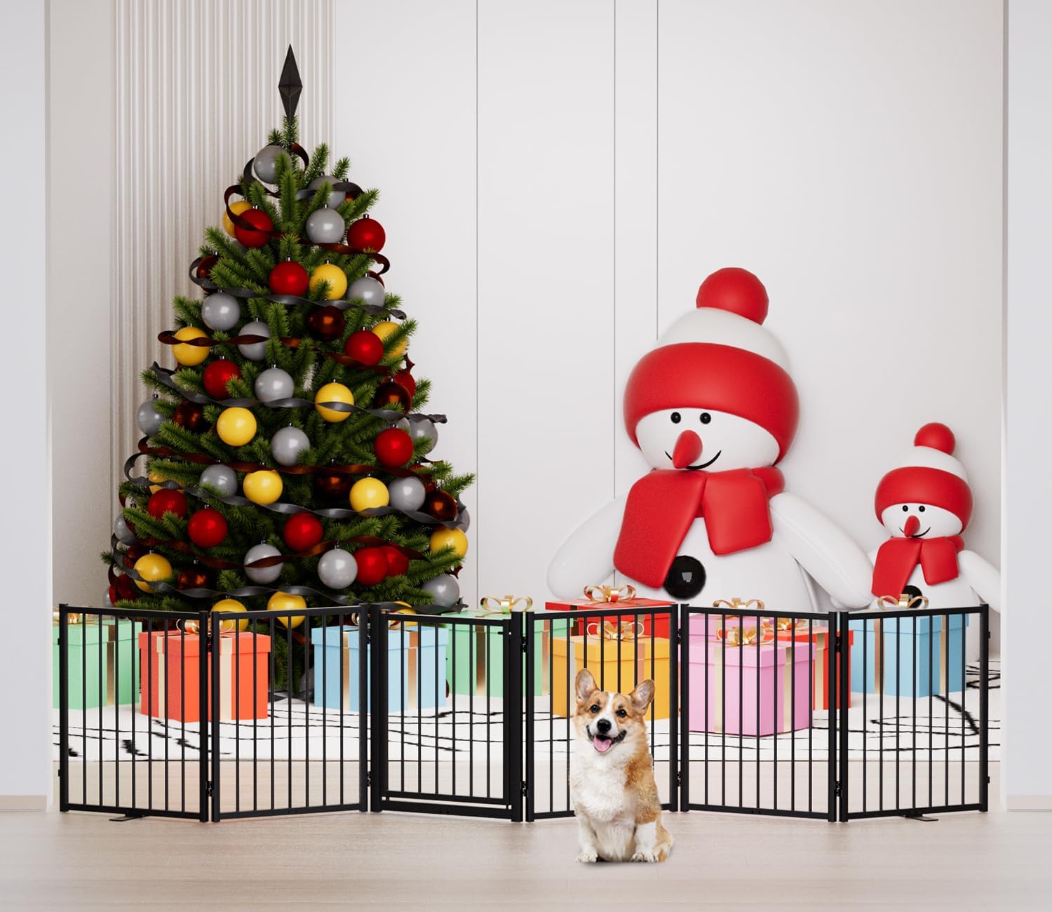 - [Walk-Through Door]: 4 panels and 6 panels dog pet gate features a convenient walk-through door, the door can open in both directions, allowing easy access. The walk-through door is equipped with a safe double lock system to ensure that the door will not be easily opened by the dog.