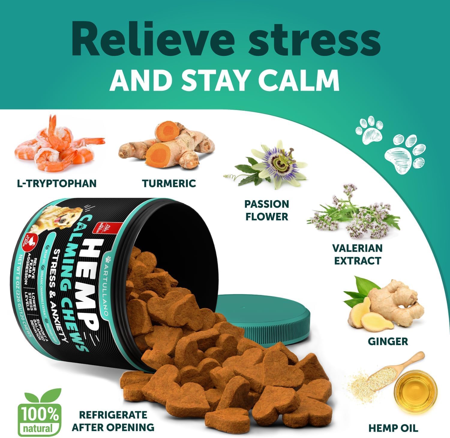 - Natural Calming Aid: dog calming chews - anxiety relief treats support help relieve your pet of any stress or anxiety using natural ingredients like passionflower, chamomile, hemp powder, hemp oil