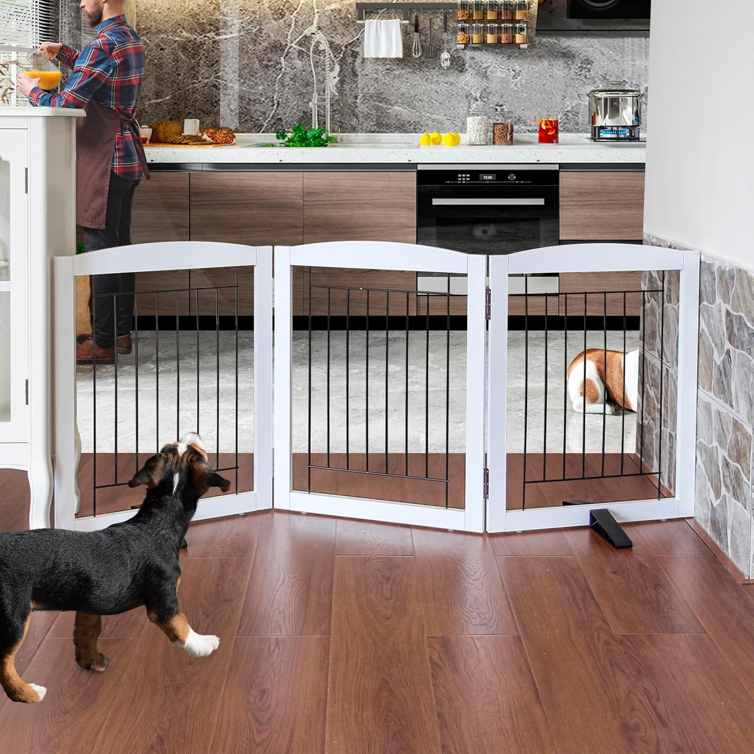- 【Simple and Firm】This convertible wooden dog gate is a pet fence, room divider, and pet pen all in one. It combines wood and electroplated steel bars. Equipped with non - slip rubber feet, it protects your floor.