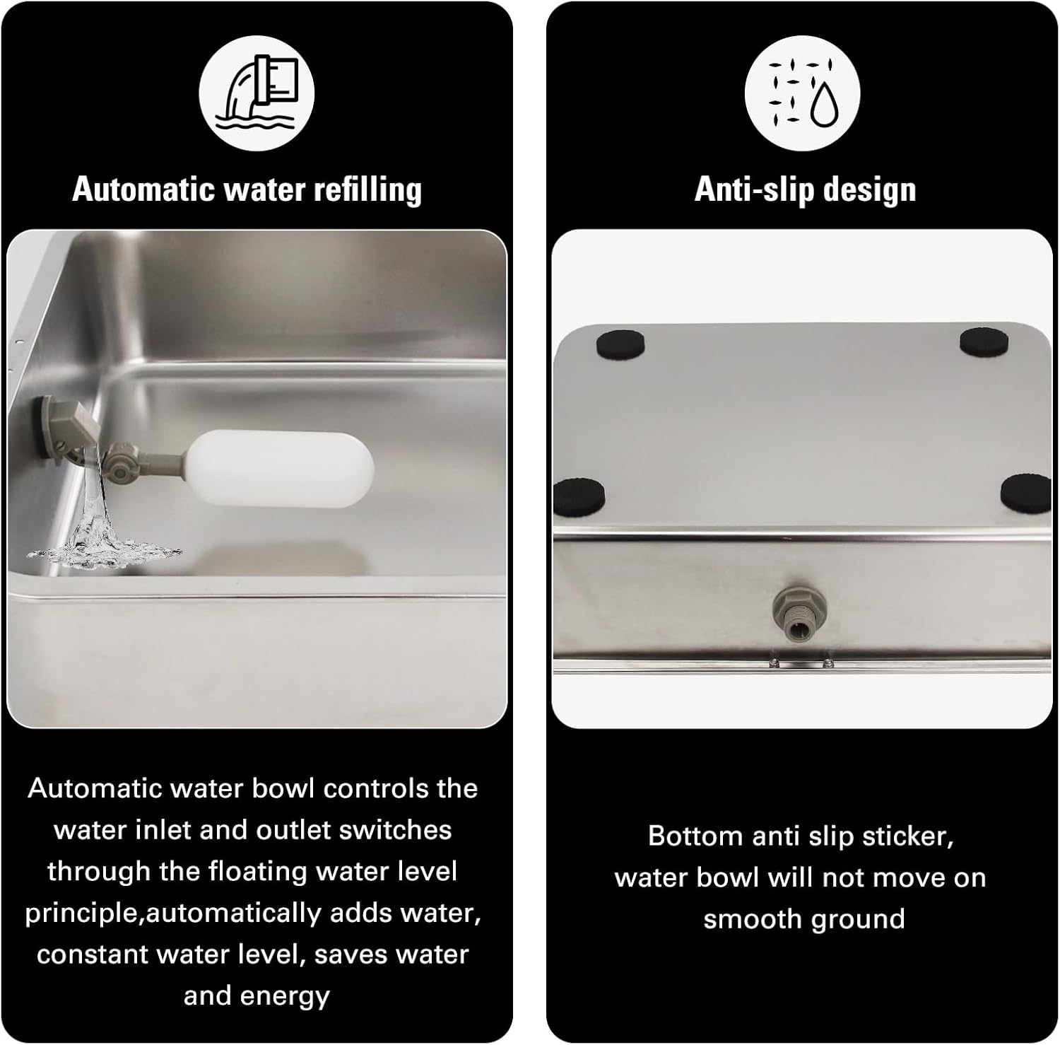 - -Large outdoor dog water bowl: Our automatic drinking bowl can hold up to about 15 liters (4 gallons) of water and can accommodate two or more large dogs drinking water at the same time. suitable for various animals such as large dogs, chickens, ducks, geese, horses, cows, goats, and pigs, meeting their daily hydration needs. Compared to regular drinking bowls, it has a larger capacity and improved water-saving efficiency.