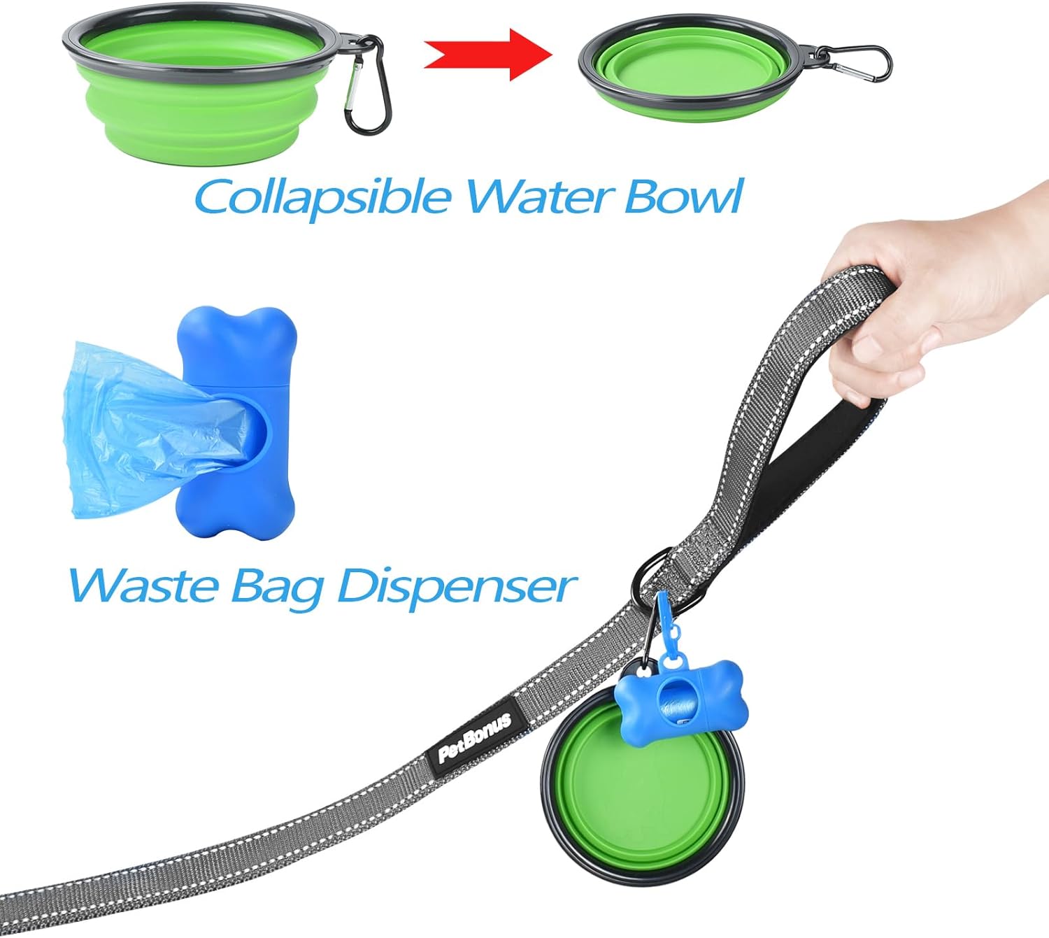 - More Convenient to Use: Each dual dog leash package includes one collapsible dog bowl and one waste bag dispenser