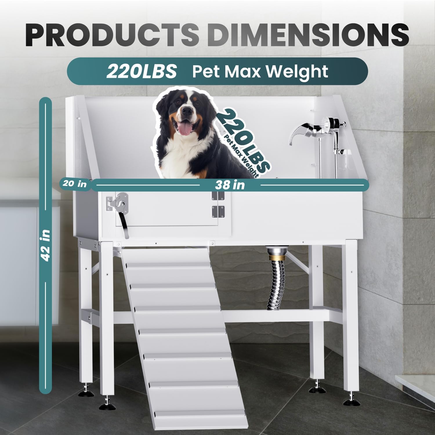 - Built to withstand up to 220 pounds, our dog washing station for home features a powerful drainage system. Whether indoors or outdoors, it fits seamlessly into utility rooms, garages, pet stores, and veterinary clinics. Versatile and durable, this dog grooming tub and dog bathing station are designed to provide a convenient and efficient bathing experience in various settings