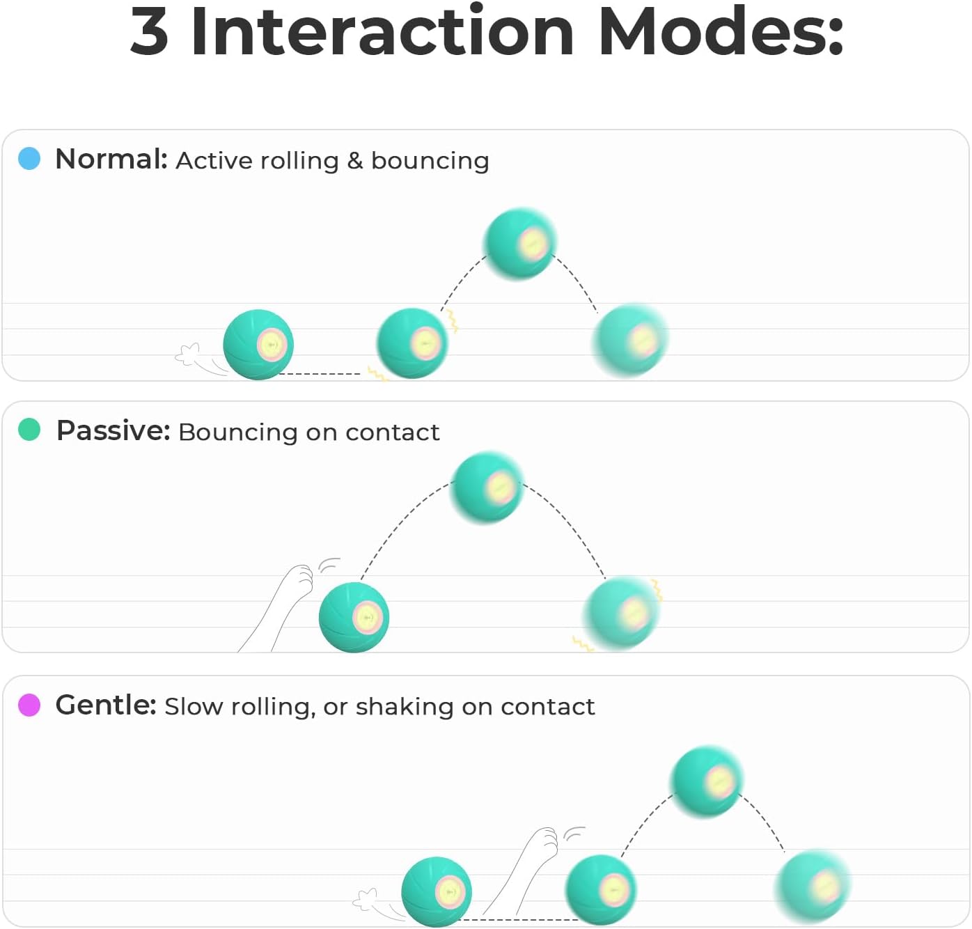 - 【3 Interactive Modes】As a mentally stimulating and entertainment toy for dogs, Cheerble Wicked Ball PE is specially designed for active or timid puppies or bored adult dogs. Upon being turned on, it will automatically roll, shake or bounce. There are 3 interaction modes: Passive, Normal, and Gentle among which you can switch to make it suitable for different dog plays. The cool LED light will also be turned on to catch your dog's attention immediately.