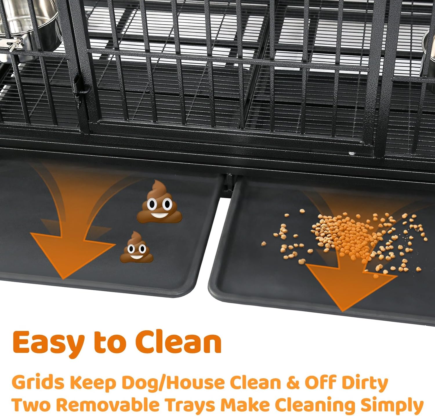 - Easy to Clean: Our indestructible steel dog crate features metal floor grids ( Removable & Waste filter) that keep your dog away from waste. The waste conveniently falls into two waster-catch trays ( Slide-out & Leak-proof ), making cleanup easy and free of hassle in this stackable heavy duty dog crate