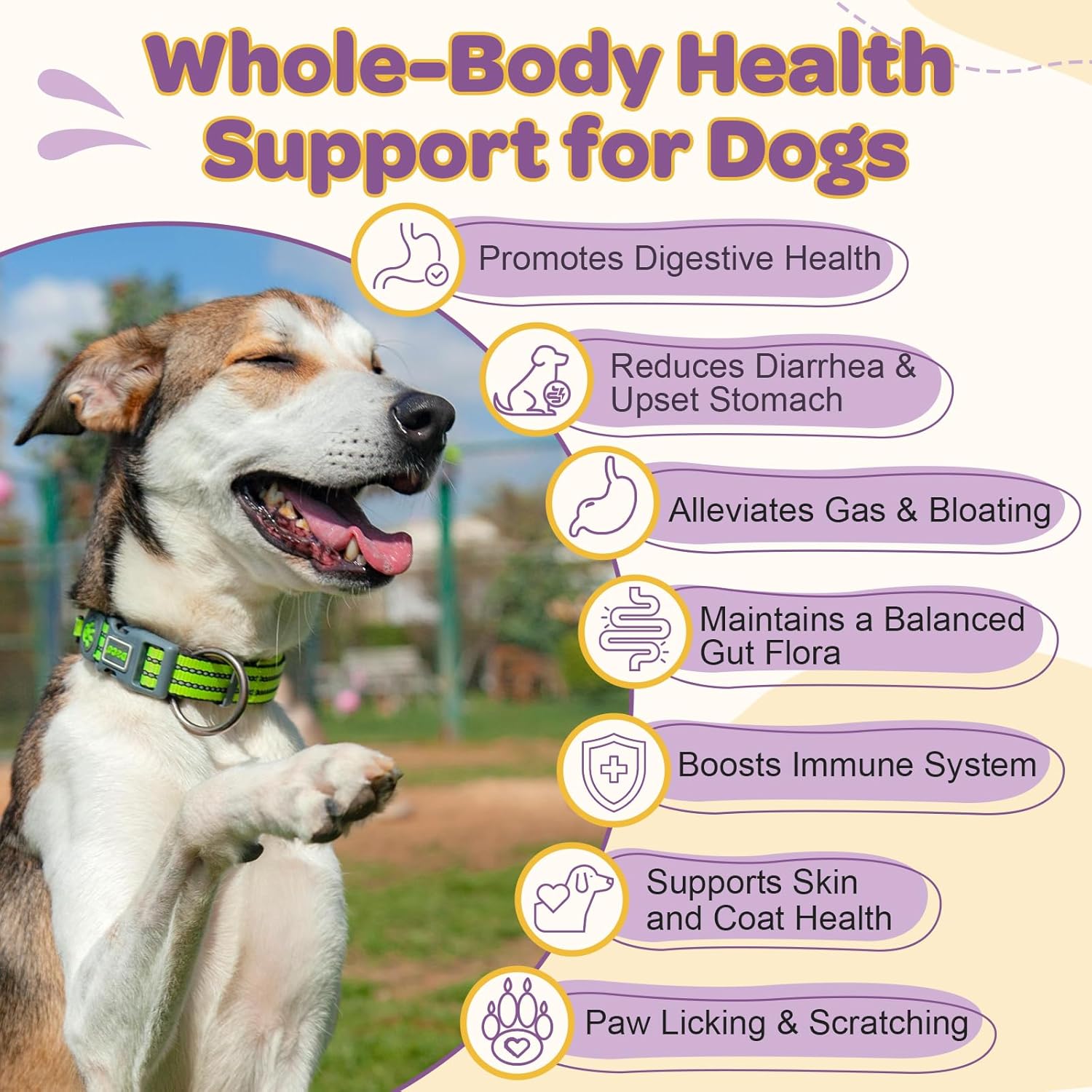 - Dog Digestive Support: Our dog probiotics enhanced with prebiotics, digestive enzymes to maximize gut balance, improve nutrient absorption, formulated to help with diarrhea, gas, constipation, bloating, and upset stomach
