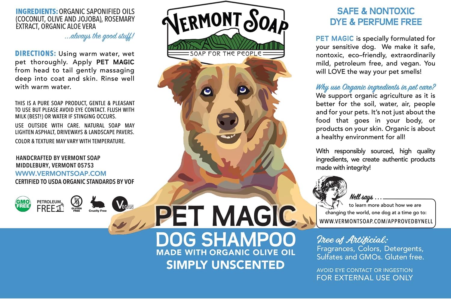 - SUITABLE FOR DOGS WITH SENSITIVE SKIN: Vermont Soap USDA organic dog shampoo is made of a gentle yet effective formula that can be used on dogs with sensitive skin. The extraordinarily milk based castile soap also keeps our pet dogs free of allerges