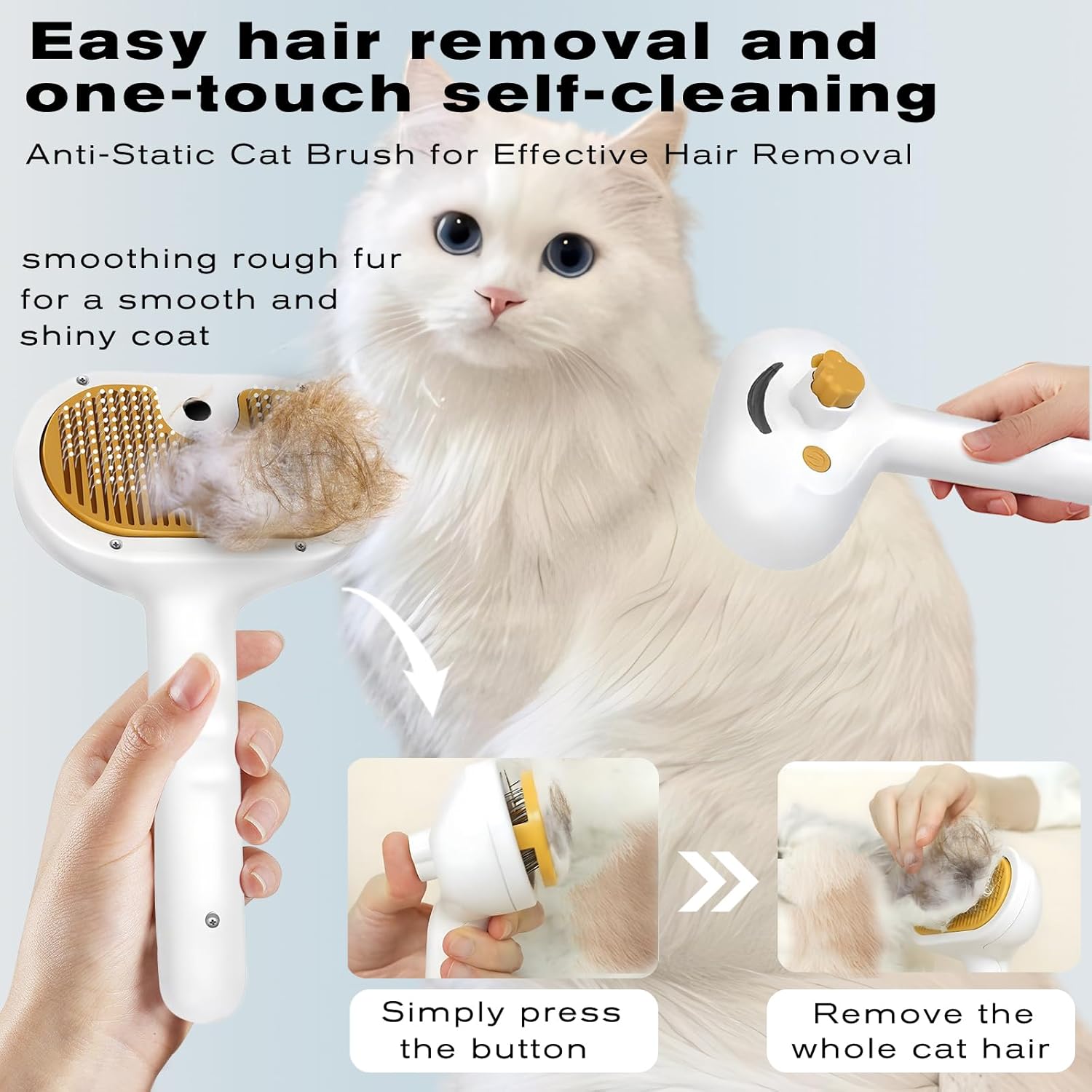 - 【Easy to Use】: Our cloud care cat brush measures 7.87 inches x 4.52 inches and weighs only 0.32 pounds, making it incredibly lightweight and compact for easy portability and storage. After grooming, simply press the cleaning button, and the hair easily falls off from the bristles, making cleanup hassle-free without hair scattering everywhere