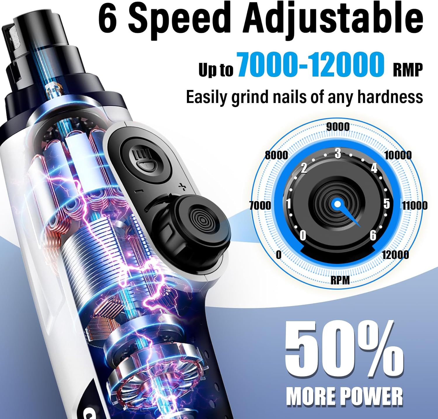 - 【Adjustable 6 Speeds for Perfect Precision】 With speeds from 7000 to 12000 RPM, the Casfuy electric dog nail file is one of the most powerful on the market. It offers 6 speed levels, each featuring 9 variable power settings. The smart optimization ensures that every speed delivers the ideal power for small, medium, and large pets’ nail care. Experience the perfect blend of power and precision.