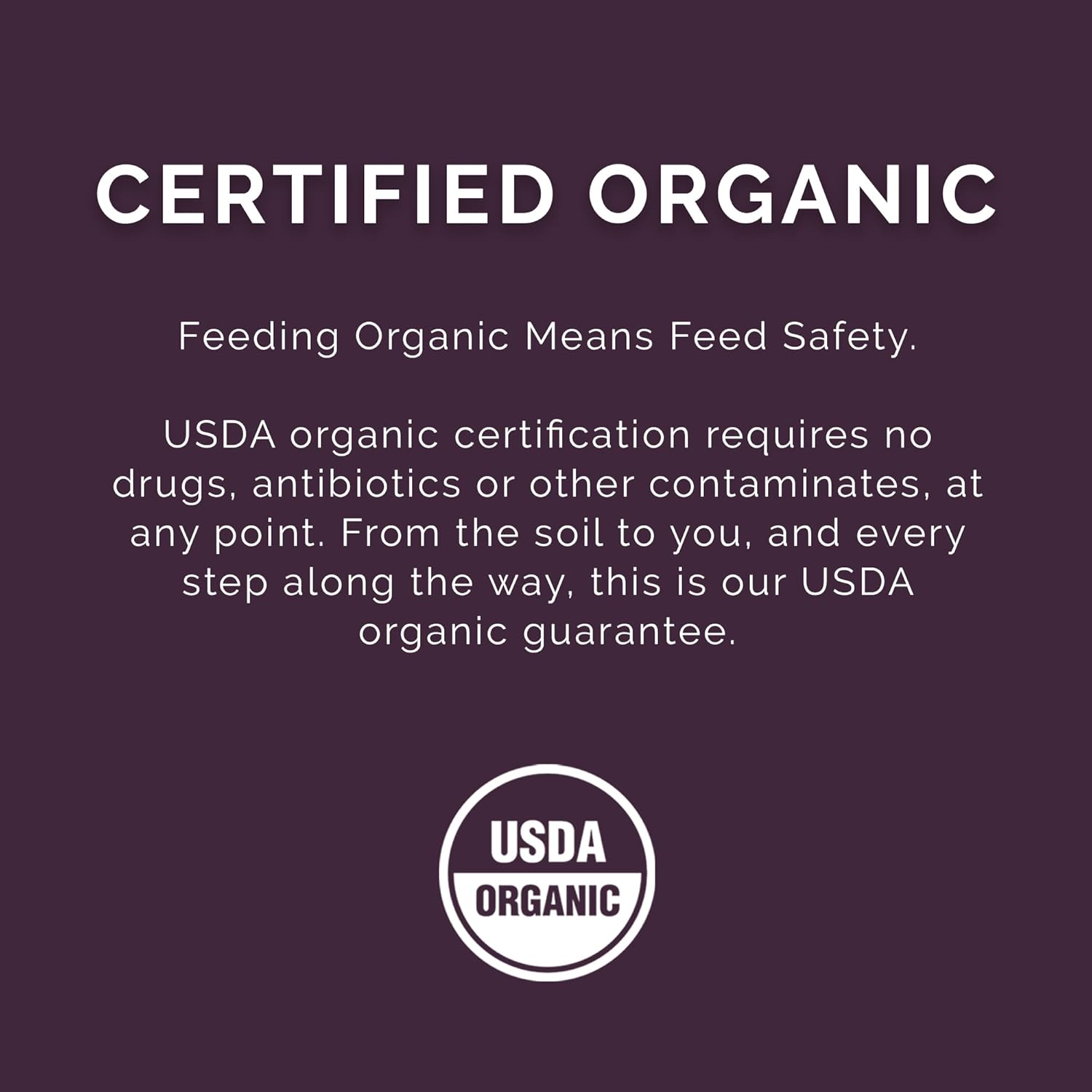 - Feeding Organic Means Feed Safety: USDA organic certification requires no drugs, antibiotics or other contaminates, at any point. From the soil to you, and every step along the way, this is our USDA organic guarantee.