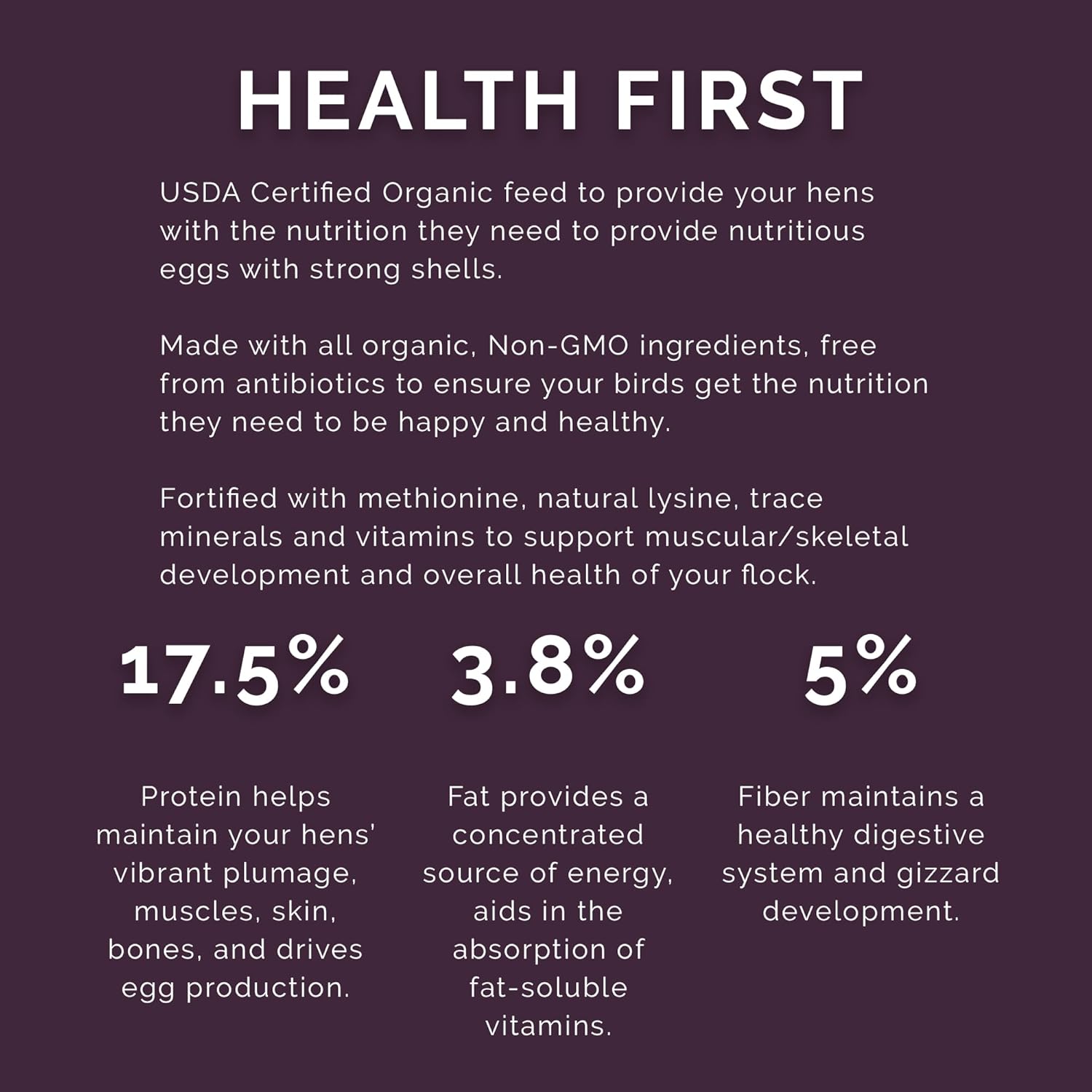 - Muscle, Bone & Digestive Support: Contains 17.5% protein for plumage, muscle and bone development, 3.8% fat for energy, and 5% fiber for gut health and gizzard development.
