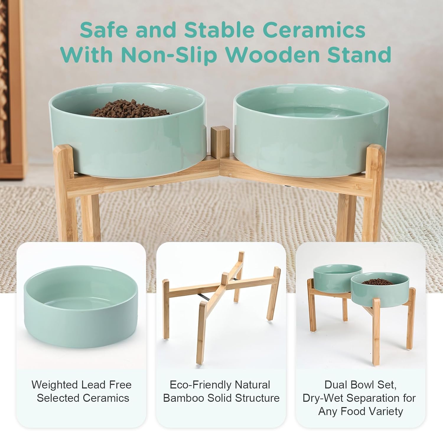 - Four Size Options to Match Any Breed – Choose 5.1" (13.5 oz), 6.1" (28.7 oz), 7.3" (42 oz), or 8.3" (60 oz) capacities with different height adjustable bamboo stand,to fit everything from kitten puppy, small to large sized breed dinners.The generous diameters and smooth ceramic surface handle everything from crunchy kibble and hearty wet food to broth‑soaked raw diets and occasional treats—the versatile pet bowls for every menu