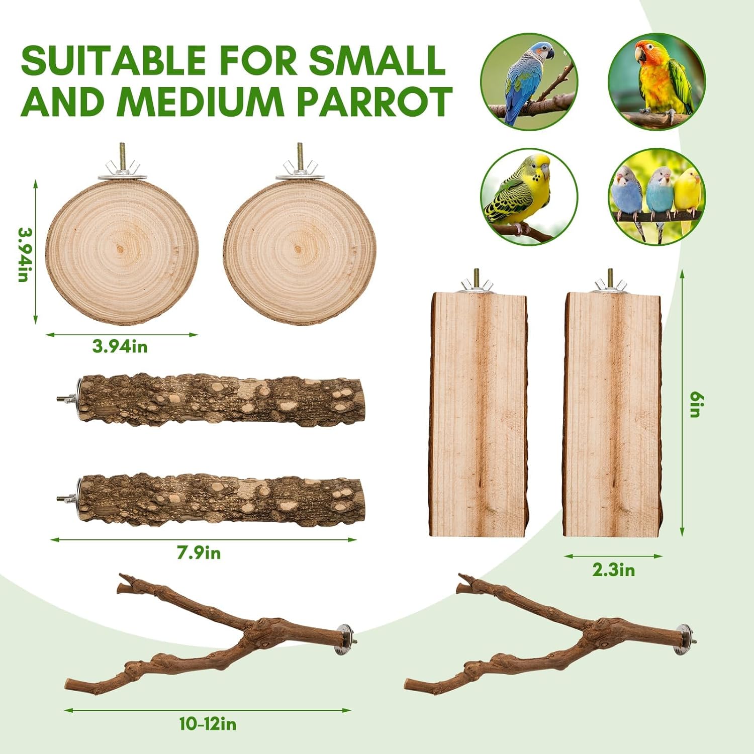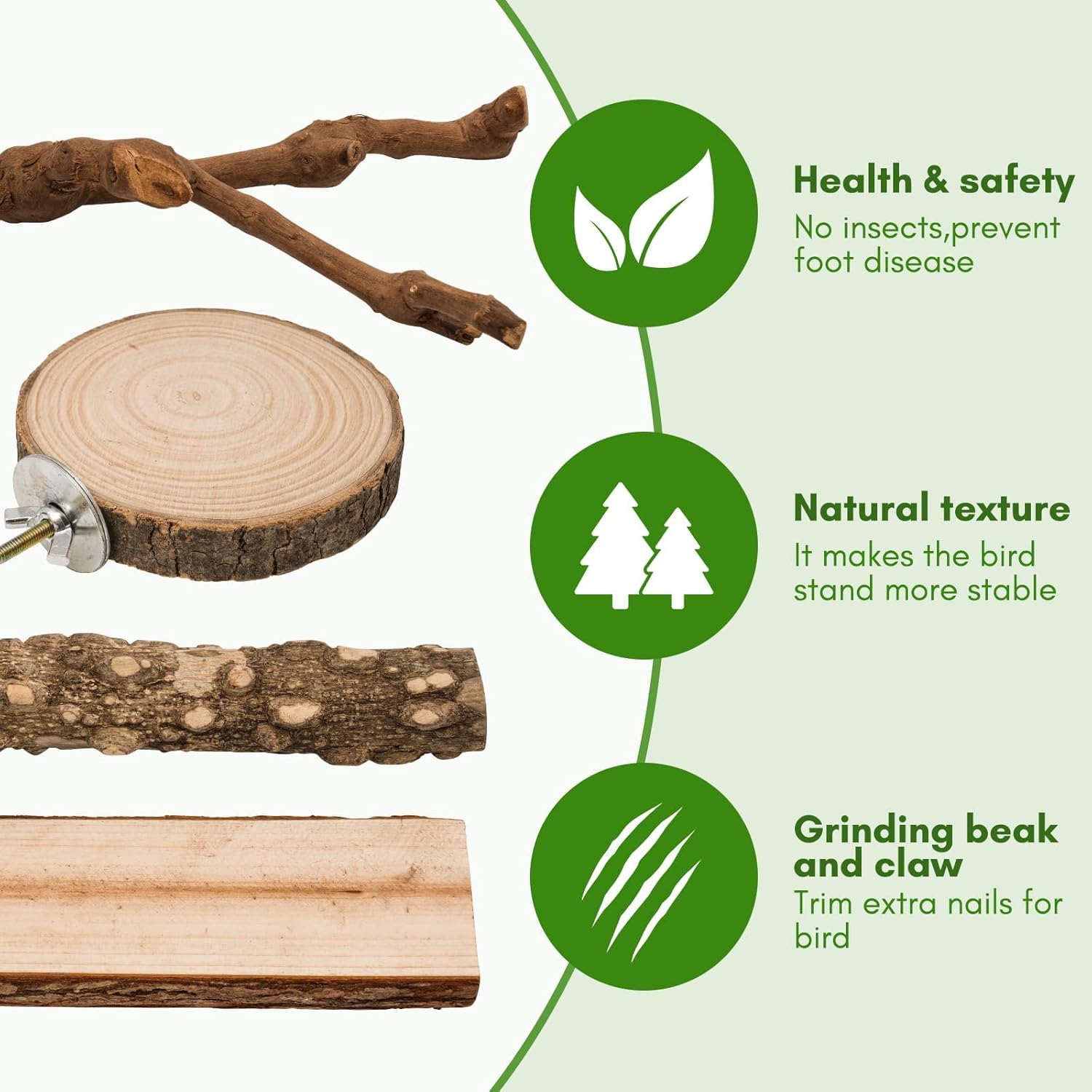 - Natural Wood: Each perch in the EELLAO bird perch set is made from natural wood, cleaned and dried to ensure safety for your pets. Since they're crafted from natural materials, each perch will have its own unique shape and size.