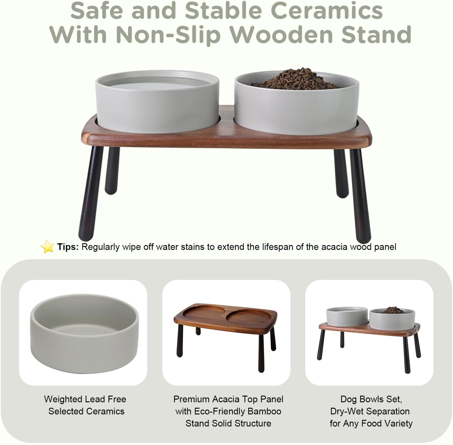 - Modern Design Meets Everyday Convenience – A aesthetic fusion of high quality ceramic and durable acacia wood and eco bamboo creates the elevated dog bowls that blends effortlessly with any home decor. Multiple colors and two different functional sets avaliable to fit the different home decor and pet's needs,The bowl tolerates microwave reheats for warm meals and slides straight into the dishwasher for easy clean, while the durable stand wipes clean in seconds—ideal for any busy pet parents