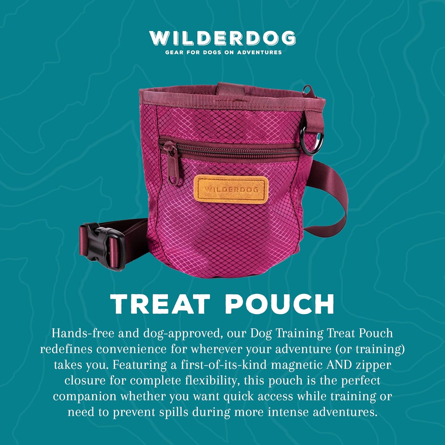 Wilderdog Dog Training Treat Pouch with Magnetic and Zipper Closure, Carabiner Attached, Adjustable Waist Strap - Magenta