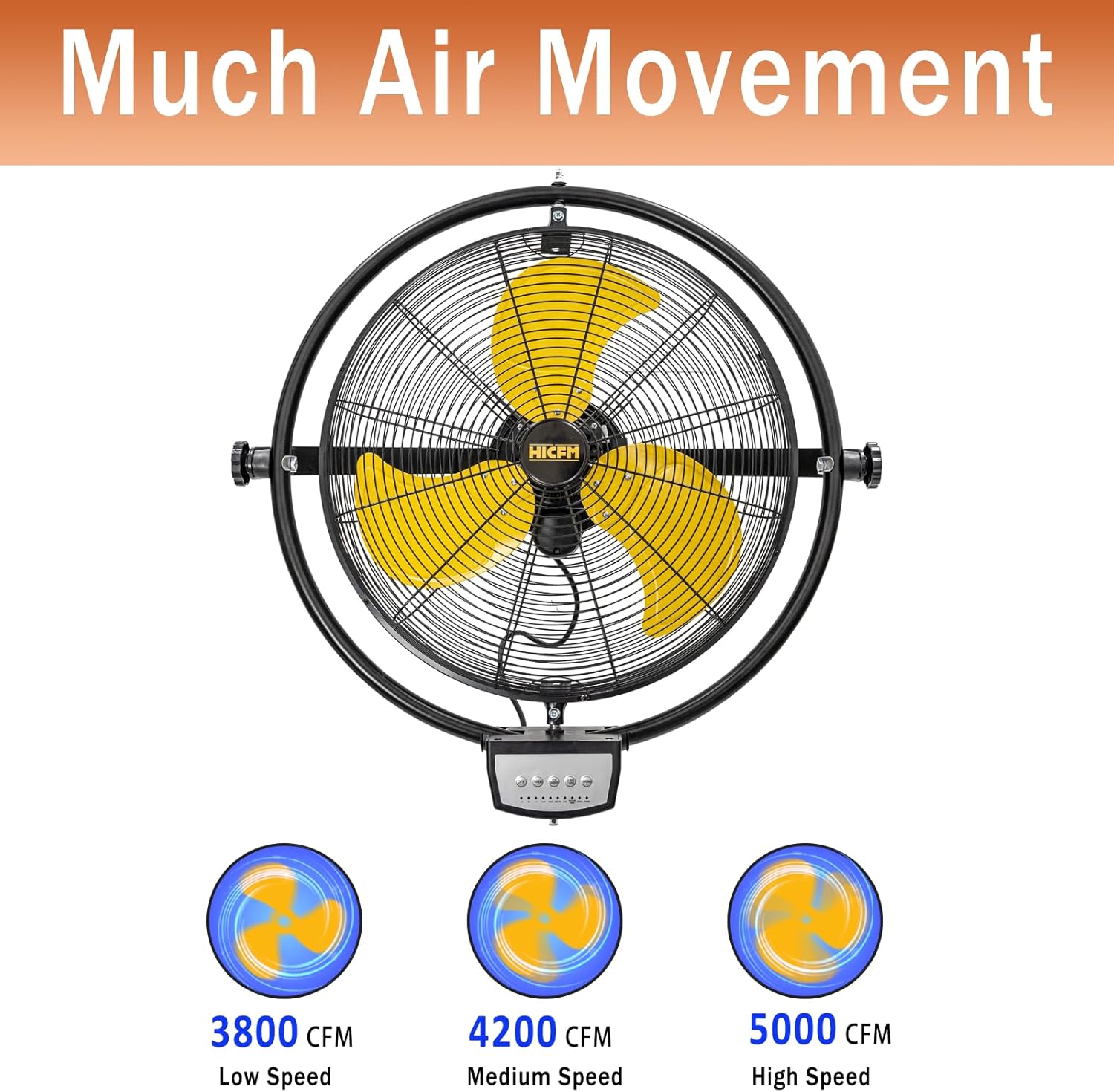 - Moves Much Air - Upgraded 1/5 HP Powerful Motor, making the 20-inch wall mount fan with Maximum 8.0m/s airflow. High velocity fan runs at 5000 CFM in high speed, medium 4200 CFM, low 3800 CFM. Great for warehouse, workshop, factory, garage, basement, and covered patio. This is an industrial wall mounted fan, the noise is slightly louder than home fans, but less noisy than most of the same size industrial fans (Wind noise 61dB by 10feet away).