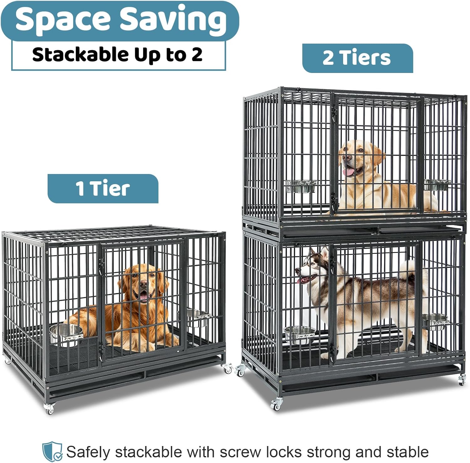 - Stackable to Save Space: The 48 inch dog crate stacks up to 2 tiers with secure screw-locks—ideal for breeders, groomers, boarding facilities, and multi-dog homes